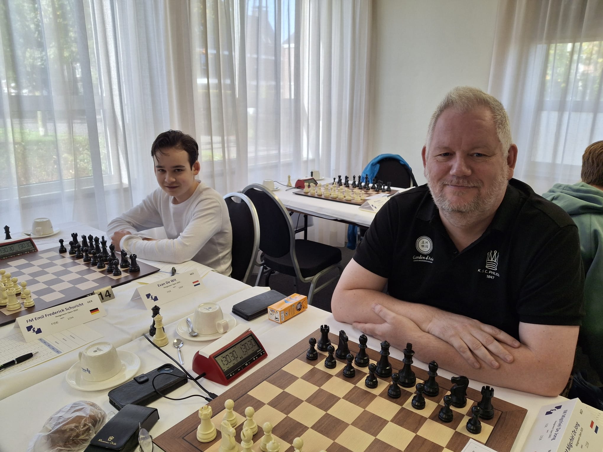 We zouden bijna vergeten dat Evan de Wit ook nog één van onze jeugdleden is. Hij speelt al twee jaar alleen nog maar bij de senioren en is inmiddels ook toegetreden tot Philidor 1 in de KNSB competitie. Ondertussen is hij op moment van schrijven slechts 14 jaar oud en zit dus nog lang niet aan zijn top. Met een FIDE rating van 2069 mocht hij voor het eerst aantreden in de open groep bij de ‘profs’ en dat pakte niet verkeerd uit. Evan begon het toernooi met een verliespartij, maar scoorde hierna twee sterke overwinningen. Nu speelden er natuurlijk vrij veel getitelde spelers in deze groep, maar toen Evan in ronde drie beter stond tegen de Oezbeekse grootmeester Ortik Nigmatov werd het wel erg spannend. Zeker voor de thuisblijvers die online de op en neer springende evaluatiebalk volgden. Nigmatov kwam namelijk een paar keer terug in de partij, maar maakte in tijdnood toch de fatale fout. Bijna strafte Evan, ook in tijdnood, dit niet af, maar na 39. …- Td5! was het duidelijk klaar. Eén zet later kon de grootmeester opgeven en was Evan een punt en een prachtige ervaring rijker!