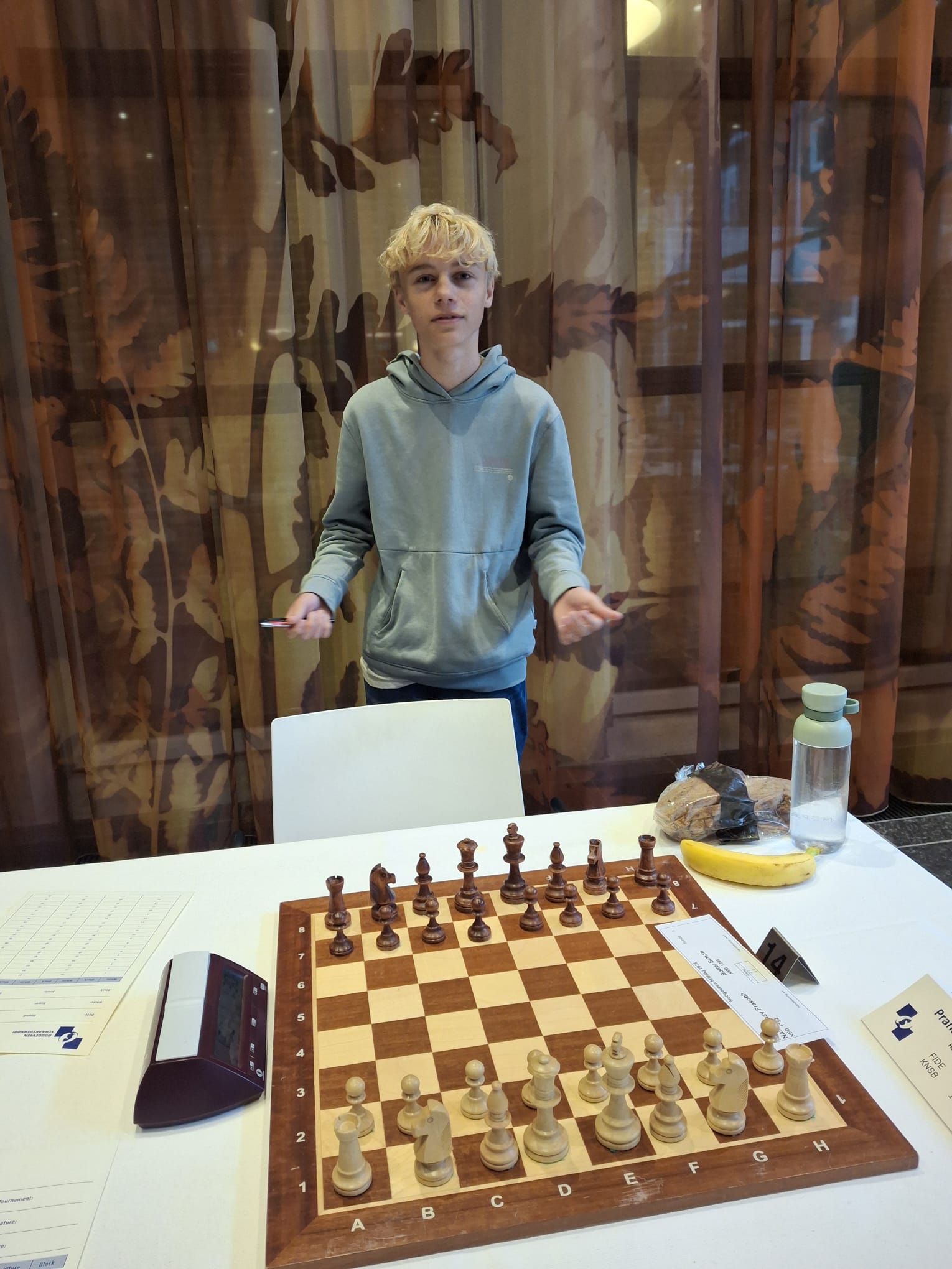 Ook de twaalfjarige Simon Botter was achteraf niet geheel tevreden met het aantal verdiende punten. De drie tegenstanders waar hij van verloor eindigden echter alle drie in de top vijf, dus zo’n schande was het niet eens. Toch waren er enkele lichtpuntjes. Zo moest hij in ronde zes tegen dezelfde speler die vorig jaar toevallig ook zijn tegenstander in ronde zes was. Toen verloor hij, dit keer was de punt voor hem. En in ronde acht speelde hij zo’n mooie partij dat hij deze graag in dit verslag wilde terugzien… totdat hij in ronde negen een nog mooiere partij speelde tegen een bekende uit het Noordelijk jeugdschaak. Dus dan maar deze. Simon kreeg met zwart een stelling op het bord die hij voorbereid had en volgens de engine speelde hij dit vervolgens foutloos uit. Na vijf winstpartijen en een bye eindigde Simon met 5,5 punten op de 22ste plaats.