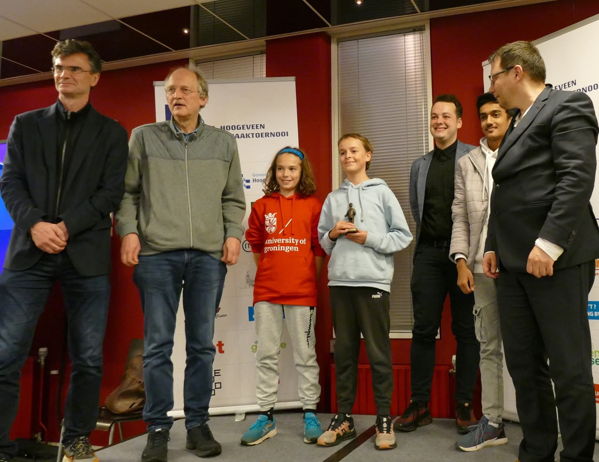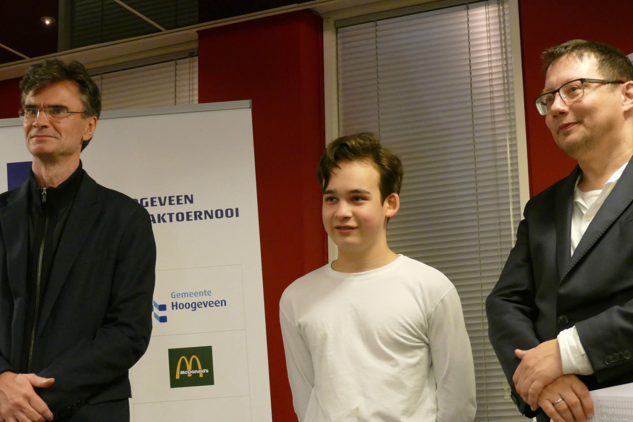 Evan op het podium met Loek van Wely en toernooidirecteur Jeroen Bottema